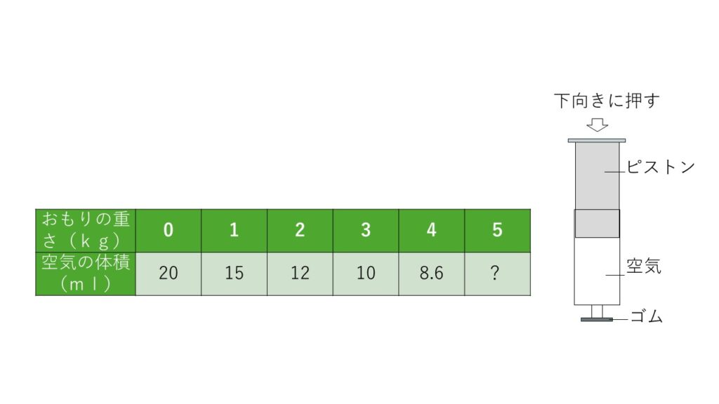 次の表を見てください。おもりと空気の体積の関係です。